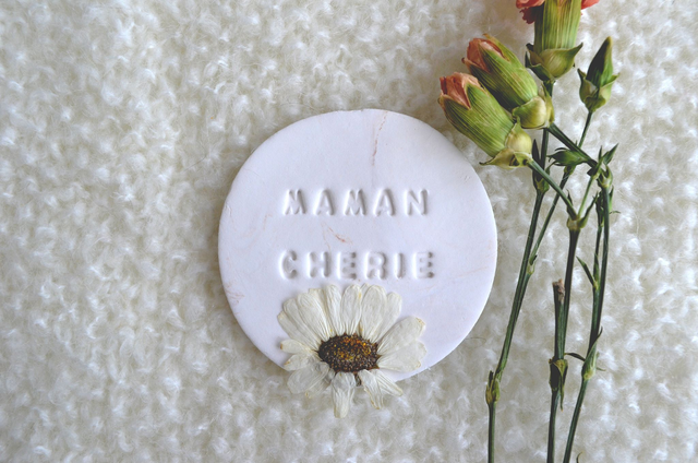 Sa texture douce, ses nuances marbrées et sa petite fleur séchée en font une création pleine de charme, parfaite pour décorer le frigo ou un panneau magnétique et glisser un sourire au quotidien.