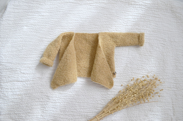 Un véritable petit gilet cocon, tricoté avec patience pendant de longues heures pour entourer le bidon de bébé de douceur. Cardigan idéal pour les premières tenues et les photos souvenirs de la maternité.