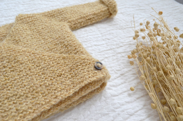 Une petite brassière de naissance douce et délicate, tricotée entièrement à la main dans un mélange chaleureux de laine mérinos et de mohair. Sa coupe cache-cœur, fermée par deux jolis boutons vintage, la rend facile à enfiler et parfaitement confortable pour les tout-petits.